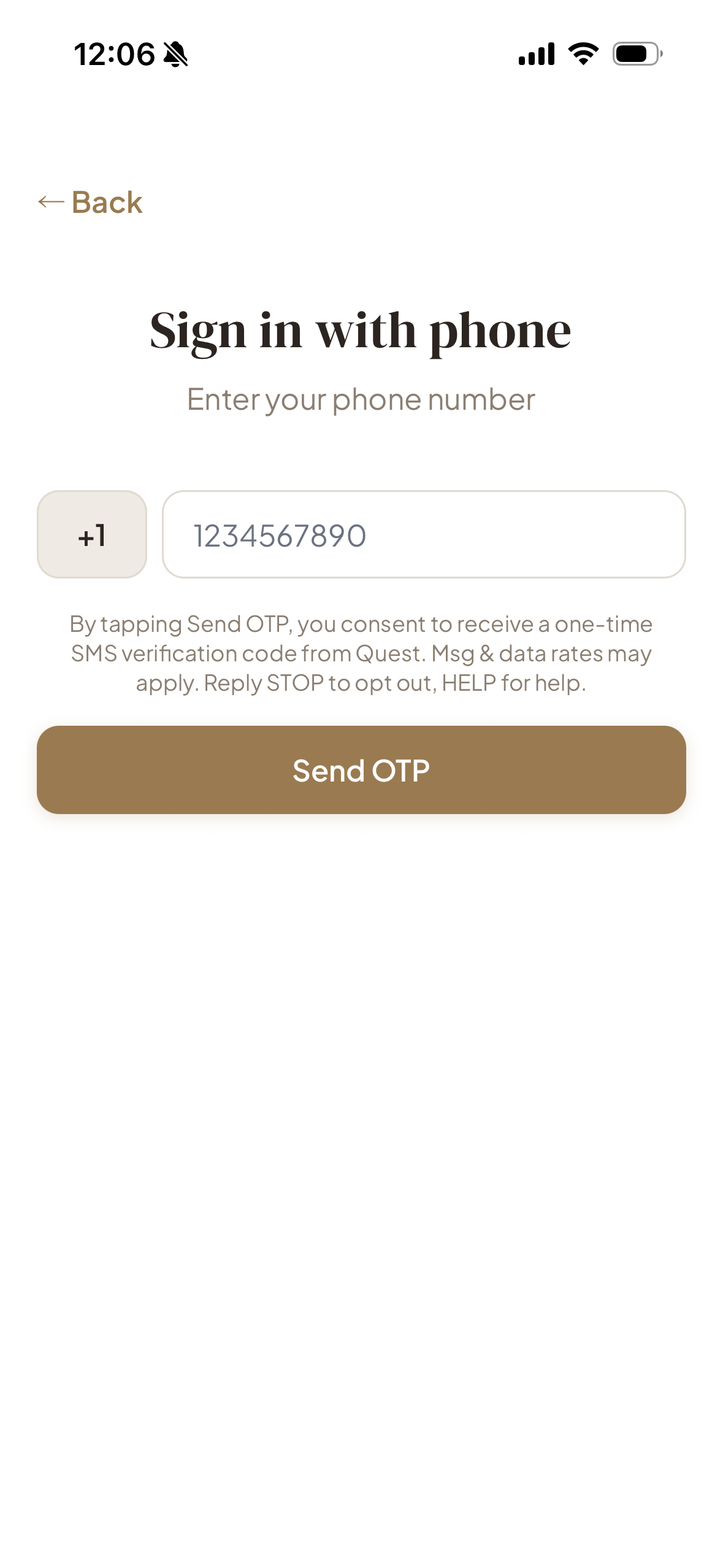 Users provide consent by entering their mobile phone number directly in the Quest app and tapping the "Send OTP" button to request a verification code. Before sending, users see explicit consent language on-screen. This is a user-initiated action — messages are sent only in response to the user's explicit request and are not recurring or automated.